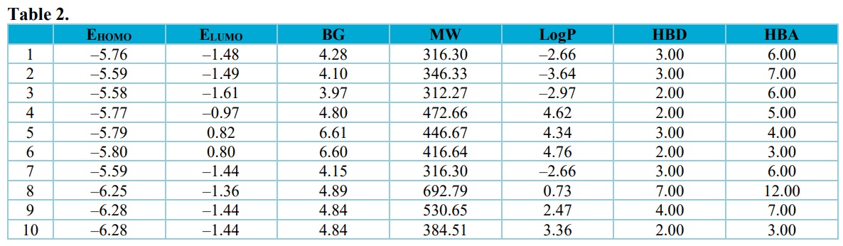 One of the crucial descriptors calculated from optimized molecular compounds as described by many researchers are the highest occupied molecular orbital energy (EHOMO), and lowest unoccupied molecular orbital energy (ELUMO) (HOMO-LUMO energies). The part taken in overriding vast array of chemical and biological interactions by HOMO-LUMO energies cannot be easily neglected (Saranya et al., 2018). The EHOMO indicates molecule with greater strength to donate electron while ELUMO indicate molecules with greater strength to accept electron from neighboring compounds. In this work, we observed that (3R)-5,7-dihydroxyspiro[2H-chromene-3,4’-9,11-dioxatricyclo[6.3.0.03,6]undeca-1(8),2,6-triene]-4-one (3) has highest strength to donate and receive electrons from nearby compounds. Also, lower band gap indicates spontaneous interactions between two molecules (Latona et al. 2022a); thus, (3R)-5,7-dihydroxyspiro[2H-chromene-3,4’9,11-dioxatricyclo[6.3.0.03,6]undeca-1(8),2,6-triene]-4-one (3) showed a greater strength to interact with neighboring compounds than other studied compounds (Supplementary Material 1). As we observed in this work, lower number of atoms highly contributed to high level of interacting ability of compound 3; this revealed the effectiveness of the combination of the atom as well as the bonds present in (3R)-5,7-dihydroxyspiro[2.-chromene-3,4'-9,11-dioxatricyclo[6.3.0.03,6]undeca-1(8),2,6-triene]-4-one (3). Other descriptors obtained from compounds from S. natalensis bulb were also reported in Table 2.