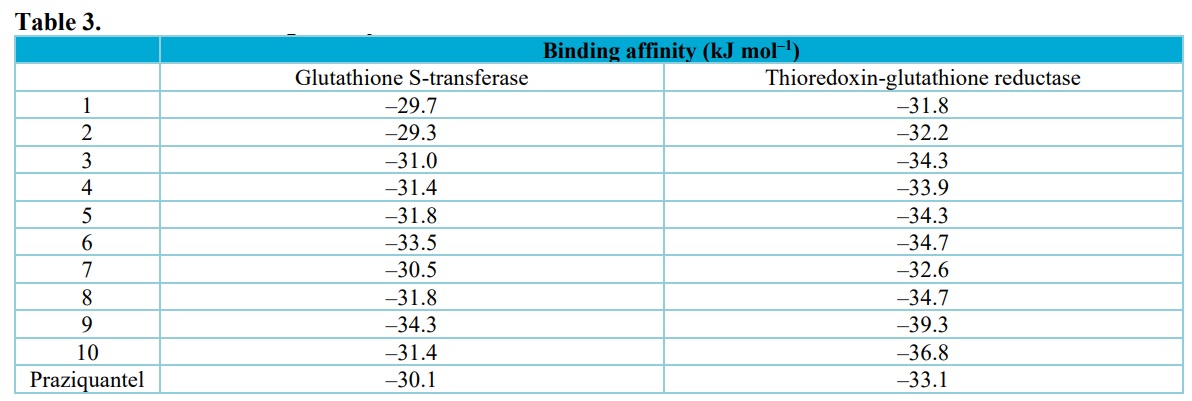 Abstract: Schistosomiasis remains one of the severe ailments that affect both man and woman in South Africa. It is caused by blood fluke, and the rate at which it causes death is alarming in some areas of America, Asia as well as in African countries. It is a neglected tropical disease (NTD) with grave impact on social and economic situation of countries with low sanitation awareness. Thus, the search for lasting solution to this menace, has drawn the attention of many global researchers using phytochemicals from Scilla natalensis via in silico approach. The studied compounds were optimized using Spartan 14. Docking study was executed via Pymol, Autodock tool, Auto dock vina and discovery studio. Compound . with –34.3 kJ mol–1 and –39.3 kJ mol–1 as binding affinity proved to possess highest ability to inhibit glutathione S-transferase and thioredoxin-glutathione reductase than other compounds. Also, ADMET properties for compound . and praziquantel were explored and reported. Our findings may open the door for the design of novel drug-like molecules with better efficiency.