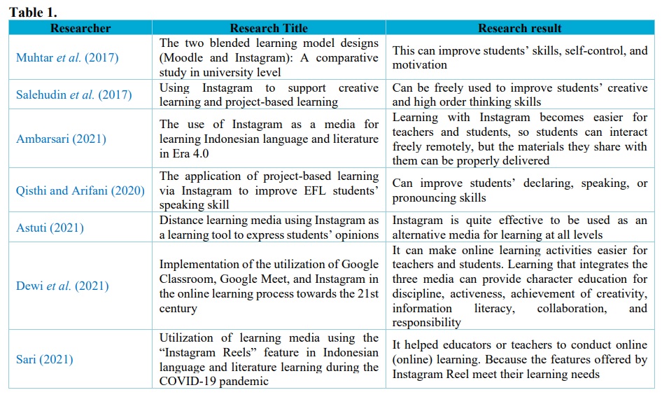 The popularity of Instagram makes it effective to be used as a studying platform. That advantage of Instagram as a learning-based media, compared to other ones, is that it is more interesting, it is accompanied by illustrations, pictures, it is accessible anytime and anywhere, easy to use, and has no limit on the number of users. Nastiti (2019) proposed that Instagram can help teachers delivering subject matter, improving learning outcomes, helping students understand the material, and attracting students’ attention—so that this platform is suitable for use as a learning medium.