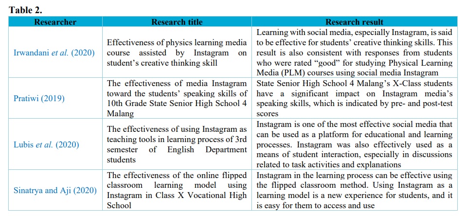 Pratiwi (2019) suggested that Instagram had a significant impact on the speaking skills of Class X students at Malang State High School 4, as evidenced by the pre- and post-test results. The aim of this study was to determine the effectiveness of using Instagram for these students’ speaking skills. Lubis et al. (2020) found that Instagram is also used effectively as a means of student interaction, especially in activity-related discussions and task explanations. In addition, almost all students use this app, so they find it easier to use. The aim of this study was to examine the effectiveness of implementing Instagram in distance teaching and learning. Sinatrya and Aji (2020) proposed using this flipped classroom learning model to determine the effect of implementing Instagram on the learning process. This was evidenced by the significant increase before and after the test. The authors considered that using Instagram as a learning tool is a new experience that is easy for students to access and use.