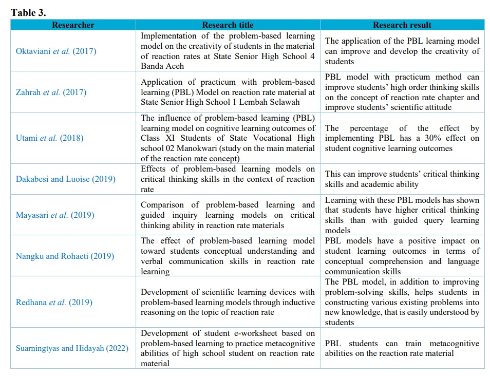 Suarningtyas and Hidayah (2022) suggested that the Student E-Worksheet Based on PBL could train students’ metacognitive skills in reaction rate material. Arends (2008) proposed three learning outcomes achieved by students taught with PBL: (i) research and problem-solving skills; (ii) learning adult role behavior; and (iii) suggested independent learning skills. Through problem-solving, students are empowered to use their logical reasoning, problem-solving and higher intellectual skills. Ultimately, PBL educates students to become independent learners. Improving their problem-solving skills can be very useful in life, as they develop the ability to deal with any problem in the environment.