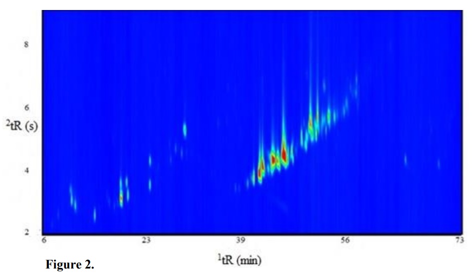 The GC×GC has the advantage of increasing the resolution and sensitivity of the analysis due to the concentration of the sample fraction through the modulation process allowing the detection of compounds in trace levels as well as the separation of related compounds in the second dimension (Baharum et al., 2010). GC×GC is the most powerful separation system now available when combined with mass spectrometry (MS).