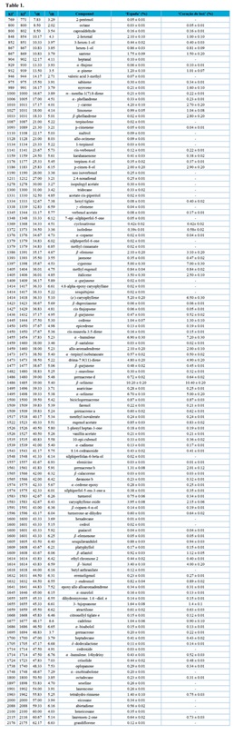Temperature-programmed retention indices (Mota et al., 2013) were calculated using a mixture of linear alkane (C6-C30), which was analyzed under the same conditions as the chromatographic analysis of the samples. The volatile components’ identification was based on comparing their mass spectra with those of the database NIST 2.0, the comparison of their retention index and mass spectrum (Adams, 2007) and the interpretation of the mass spectrum.