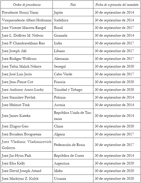 Para 2014, la Corte empezó el año con algunos cambios en su composición; así, el 6 de noviembre fueron reelegidos los jueces Mohamed Bennouna (Marruecos) y Joan E. Donoghue (Estados Unidos de América), y fueron elegidos como nuevos miembros James Richard Crawford (Australia) y Kirill Gevorgian (Federación de Rusia). La elección de un quinto miembro no pudo concluir el 6 y 7 de noviembre, ya que los dos candidatos restantes (Susana Ruiz Cerutti —Argentina— y Patrick Lipton Robinson —Jamaica—) no lograron obtener una votación de mayoría absoluta por parte de la Asamblea General y el Consejo de Seguridad. Por lo tanto, la elección se postergó hasta el 17 de noviembre. Tras la retirada de la candidatura por parte de Susana Ruiz Cerutti, Patrick Lipton Robinson logró una votación de mayoría absoluta y se constituyó como nuevo miembro del Tribunal.
