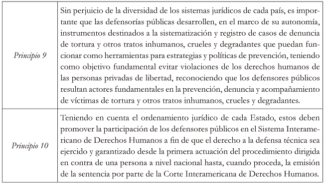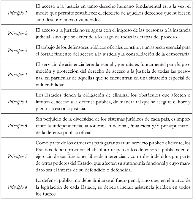 Finalmente, en noviembre el Comité Jurídico Interamericano decidió adoptar diez principios y directrices sobre la defensa pública en las Américas. El derecho a la defensa es un derecho reconocido en los Estados partes de la OEA, este debe ser debidamente protegido por los Estados. De este modo se insta a los Estados a eliminar los obstáculos que no permitan acceder adecuadamente a una defensa. Los principios adoptados son los siguientes:2