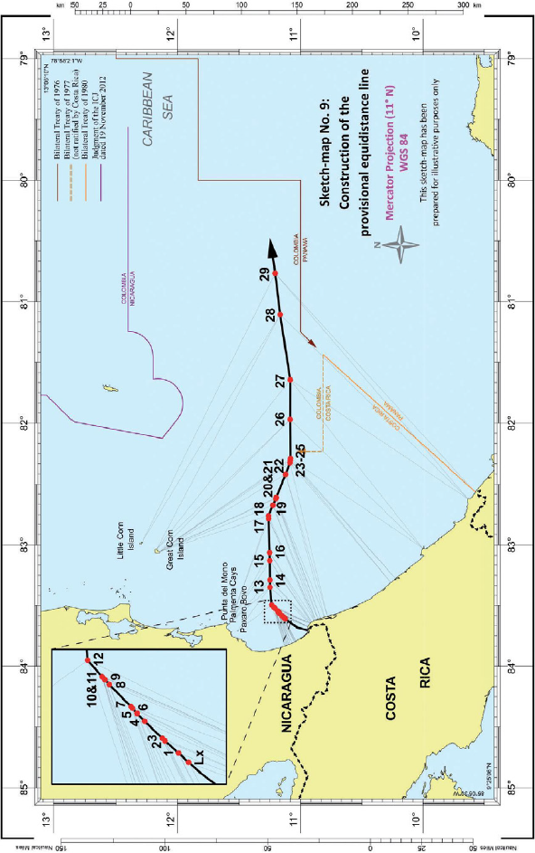 189. Del punto 1 al punto 8, el trazado de la línea de equidistancia provisional está determinado, en el lado de Costa Rica, por los puntos de base situados en la península de Santa Elena. En el punto 9 comienza a estar determinado por el punto de base de Cabo Velas, en la península de Nicoya. A partir de este mismo punto, la línea de equidistancia provisional sigue la línea geodésica con azimut inicial 245º 38’ 27.4’’ hasta que se encuentra con el límite exterior de la zee de 200 millas náuticas de las Partes (ver croquis Nº 19).