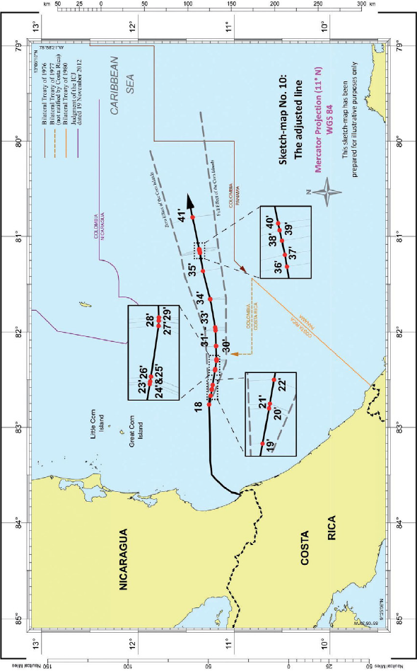 Ajuste a la línea de equidistancia provisional - Las Islas del Maíz tienen un efecto medio - La concavidad/convexidad de la costa cercana de Punta de Castilla no es una circunstancia relevante - La concavidad general de la costa de Costa Rica no es una circunstancia relevante - No hay un corte significativo de las proyecciones de Costa Rica una vez que se da el efecto medio a las Islas del Maíz - Curso de línea de equidistancia ajustada - Línea sin perjuicio de cualquier reclamo de terceros Estados - Adopción de línea simplificada sobre la base de los puntos de inflexión más significativos - Curso de línea simplificada.