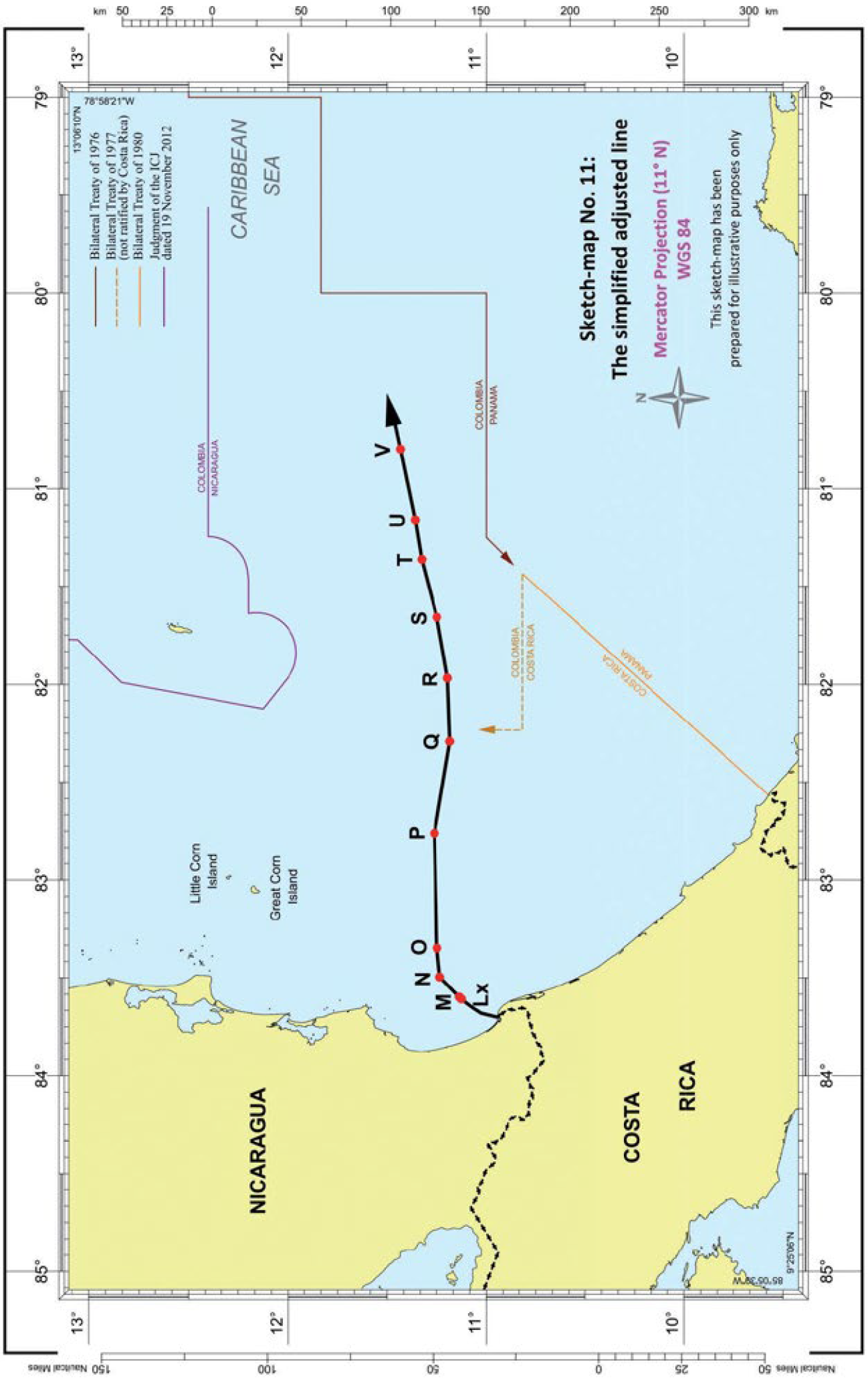 Línea de equidistancia provisional - Determinación de puntos de base - Costa natural y tierra firme utilizada para puntos de base - Puntos de base en las Islas del Maíz - Puntos de base en Paxaro Bovo y los Cayos Palmenta - Línea sin perjuicio de cualquier reclamo de terceros Estados - Curso de línea de equidistancia provisional.