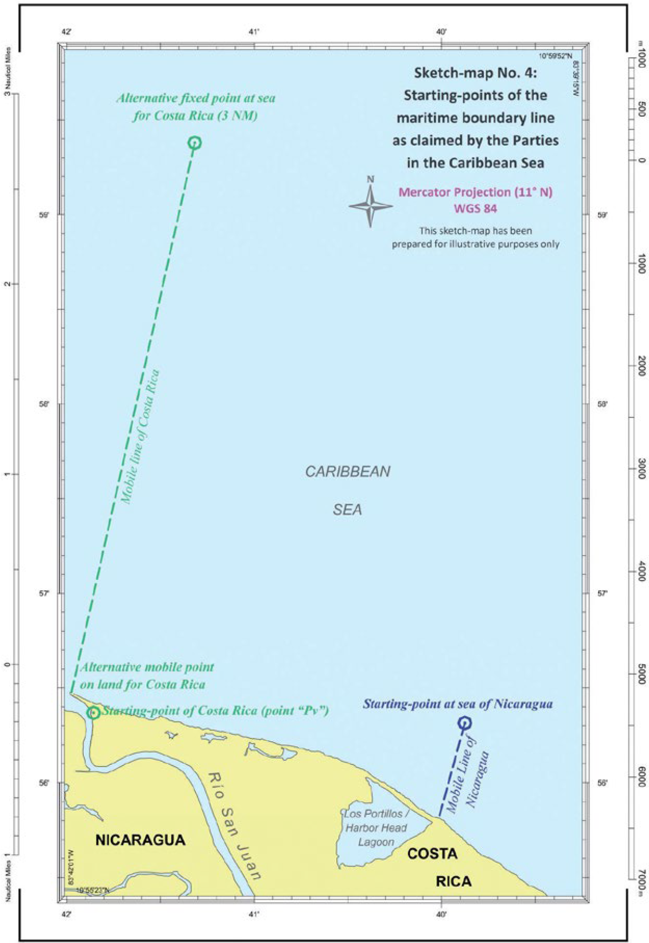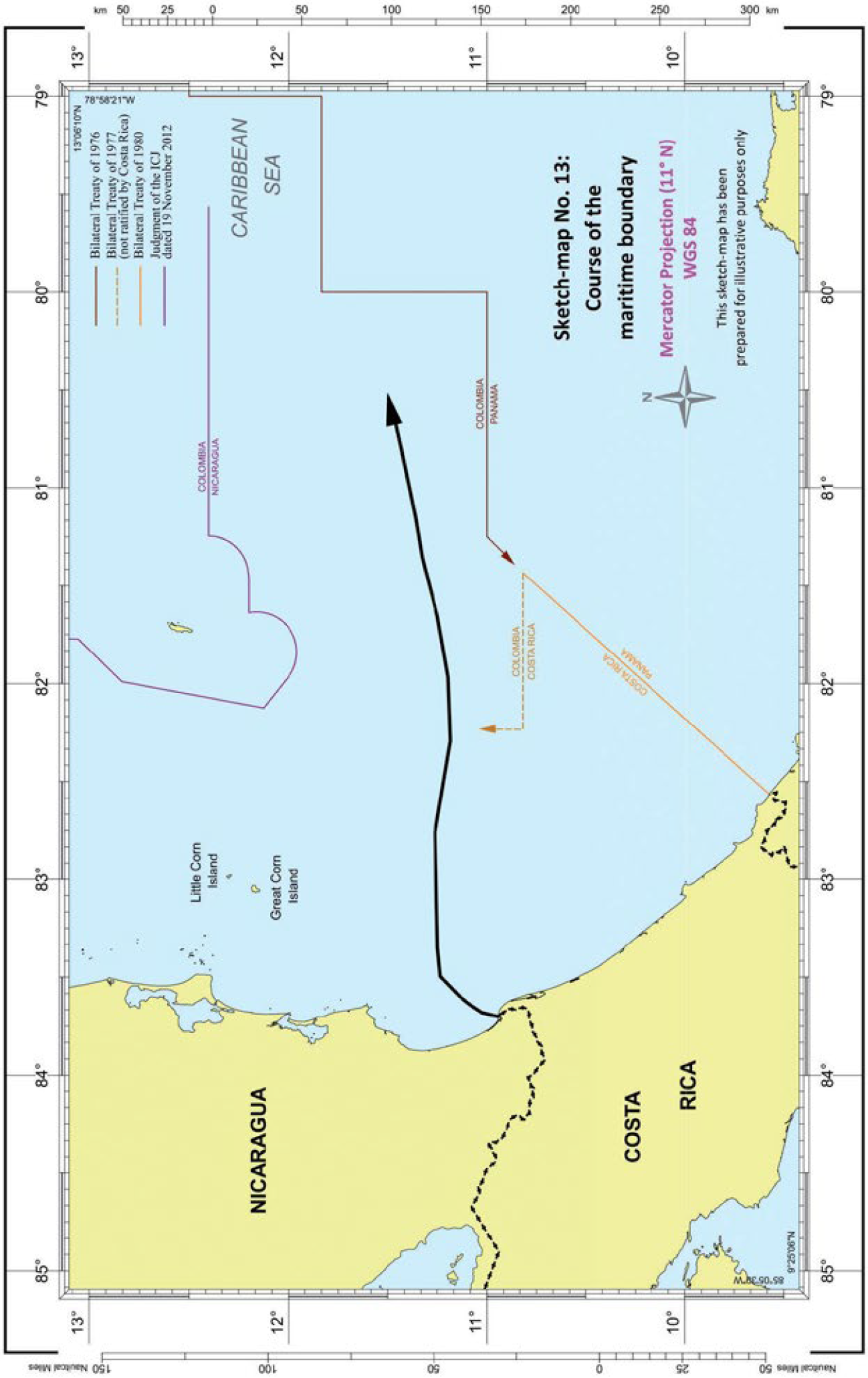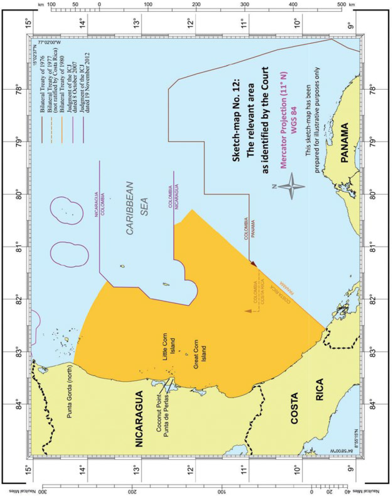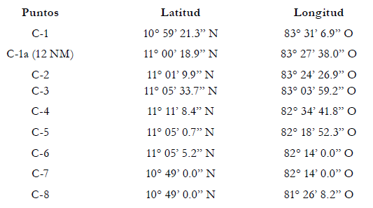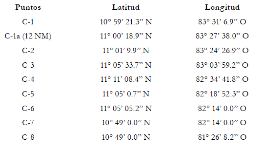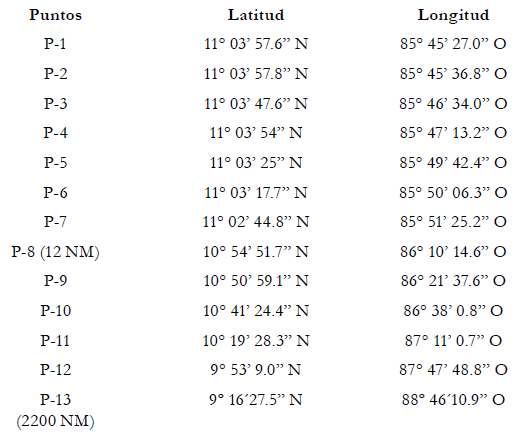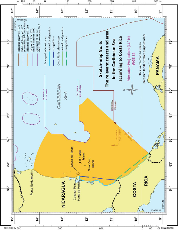 Costas relevantes-Totalidad relevante del continente costero de Costa Rica- Continente costero relevante de Nicaragua hasta Punta Gorda (norte)-Costas relevantes de Islas Maíz que no se enfrentan al norte- Costas no relevantes de Cayo de Perlas-Longitudes costeras medidas de acuerdo con la configuración natural.