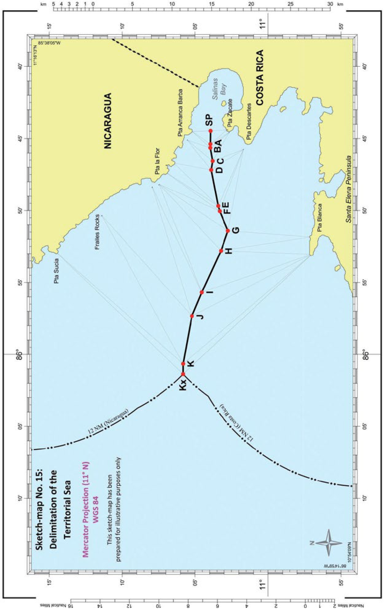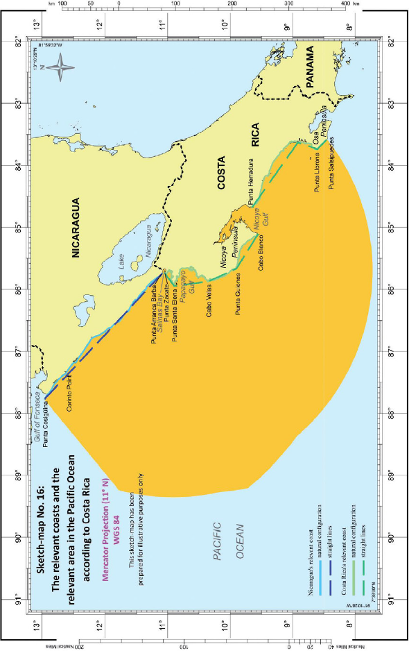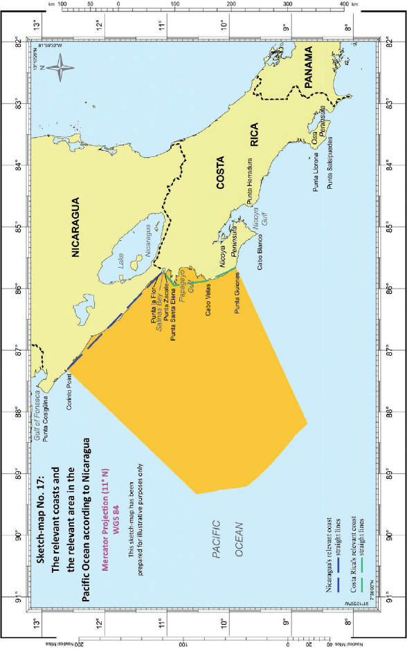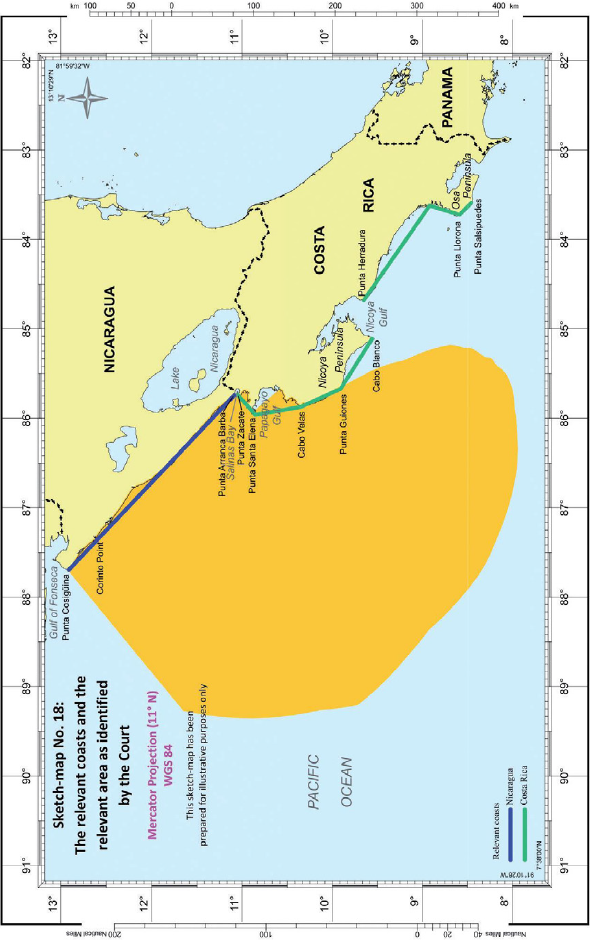 Costas relevantes - Costas relevantes de ambas Partes identificadas usando líneas rectas - Toda la costa nicaragüense relevante – La costa costarricense relevante que corre a lo largo de líneas rectas que conectan Punta Zacate, Punta Santa Elena, Cabo Velas, Punta Guiones y Cabo Blanco.
