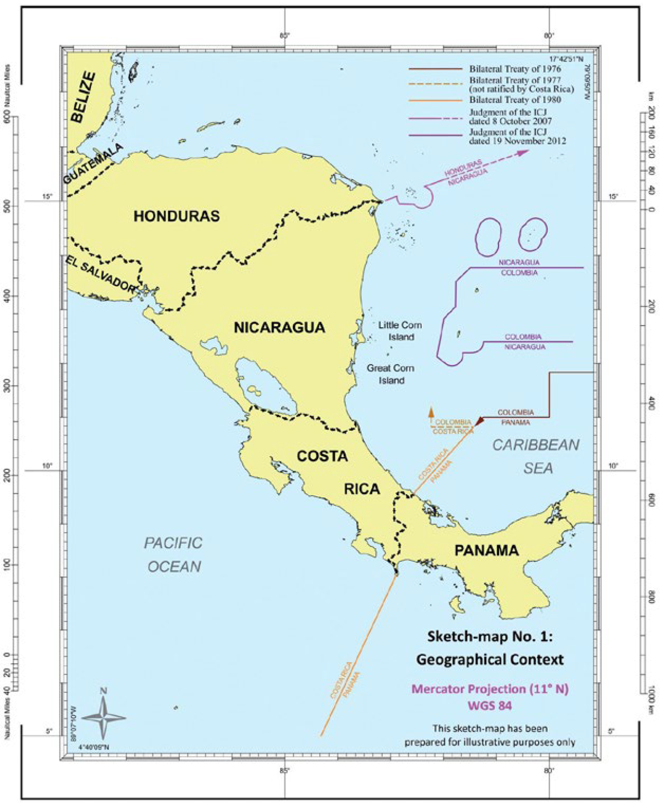Delimitaciones marítimas en el Mar Caribe y en el Océano Pacífico-Tratado de límites entre Costa Rica y Panamá de 1980-Tratado de límites entre Costa Rica y Colombia de 1977, no ratificado por Costa Rica-Sentencia de la Corte de 2007 relativa a la frontera marítima de Nicaragua con Honduras-Sentencia de la Corte de 2012 relativa a la frontera marítima de Nicaragua con Colombia – Tratado de límites entre Colombia y Panamá de 1976.