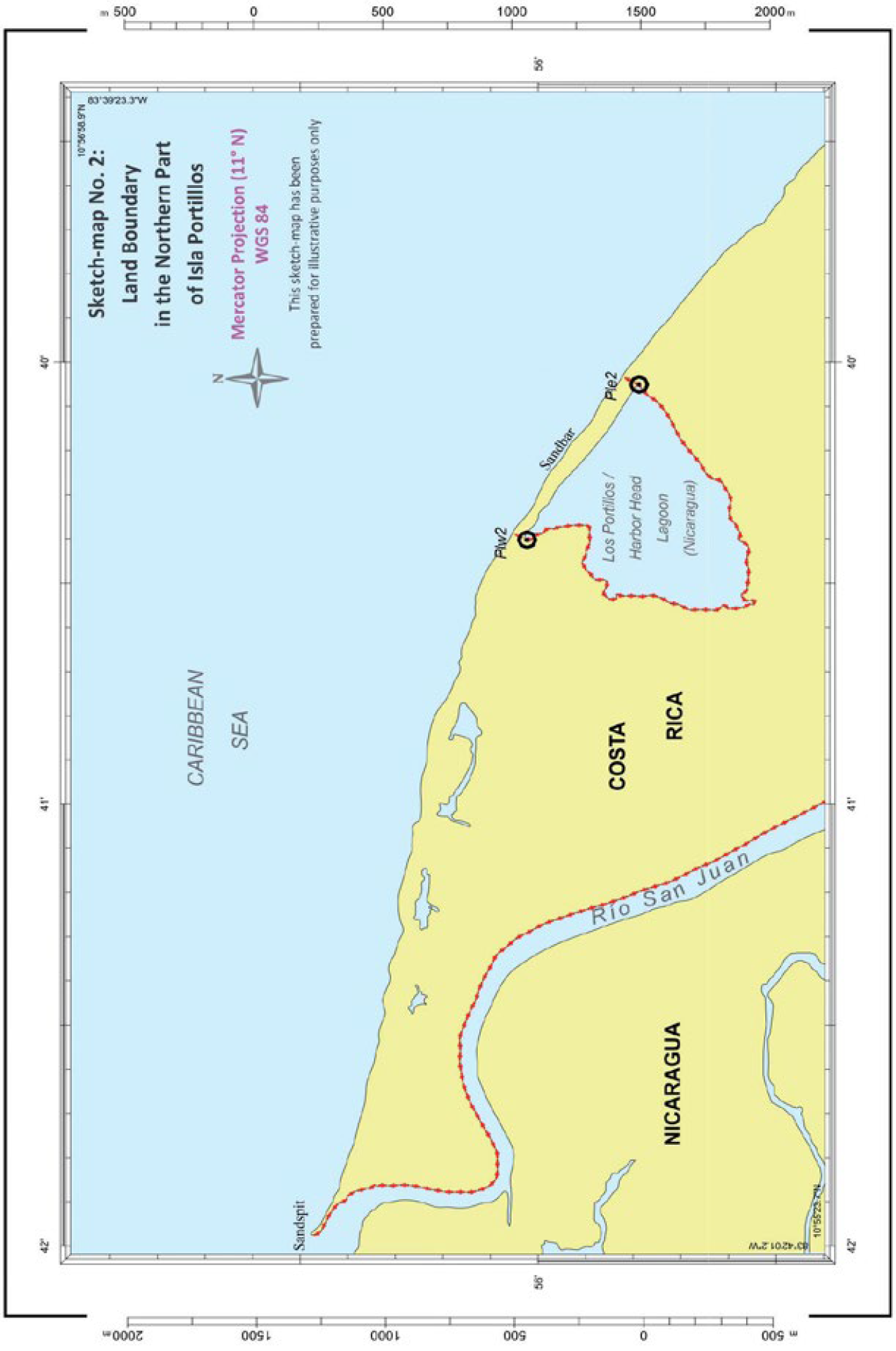 Por último, la jueza Sebutinde estima que, para determinar el trazado actual de la frontera terrestre en la parte septentrional de Isla Portillos como lo pidieron ambas Partes, es conveniente referirse primero a la forntera terrestre histórica tal y como fue definida en el tratado de límites de 1858 e interpretada por las diferentes sencencias de Cleveland y Alexander, antes de tener en cuenta todos los cambios geográficos pertinentes que podrían justificar un ajuste de esta frontera terrestre histórica. Según esto, la frontera terrestre obtenida comprende dos sectores distintos y tres puntos finales, como se puede observar en el croquis n° 2 del fallo. La jueza Sebutinde conviene, aún así, en que el putno en el que “la ribera derecha del río San Juan alcanza la línea de baja mar de la costa del mar Caribe”, tal y como está descrito en el párrafo 71, y considera el tercer punto final y el punto de partida del segundo sector de la frontera terrestre debe igualmente ser el punto de partida de donde parte, en principio, la delimitación marítima en el mar Caribe.