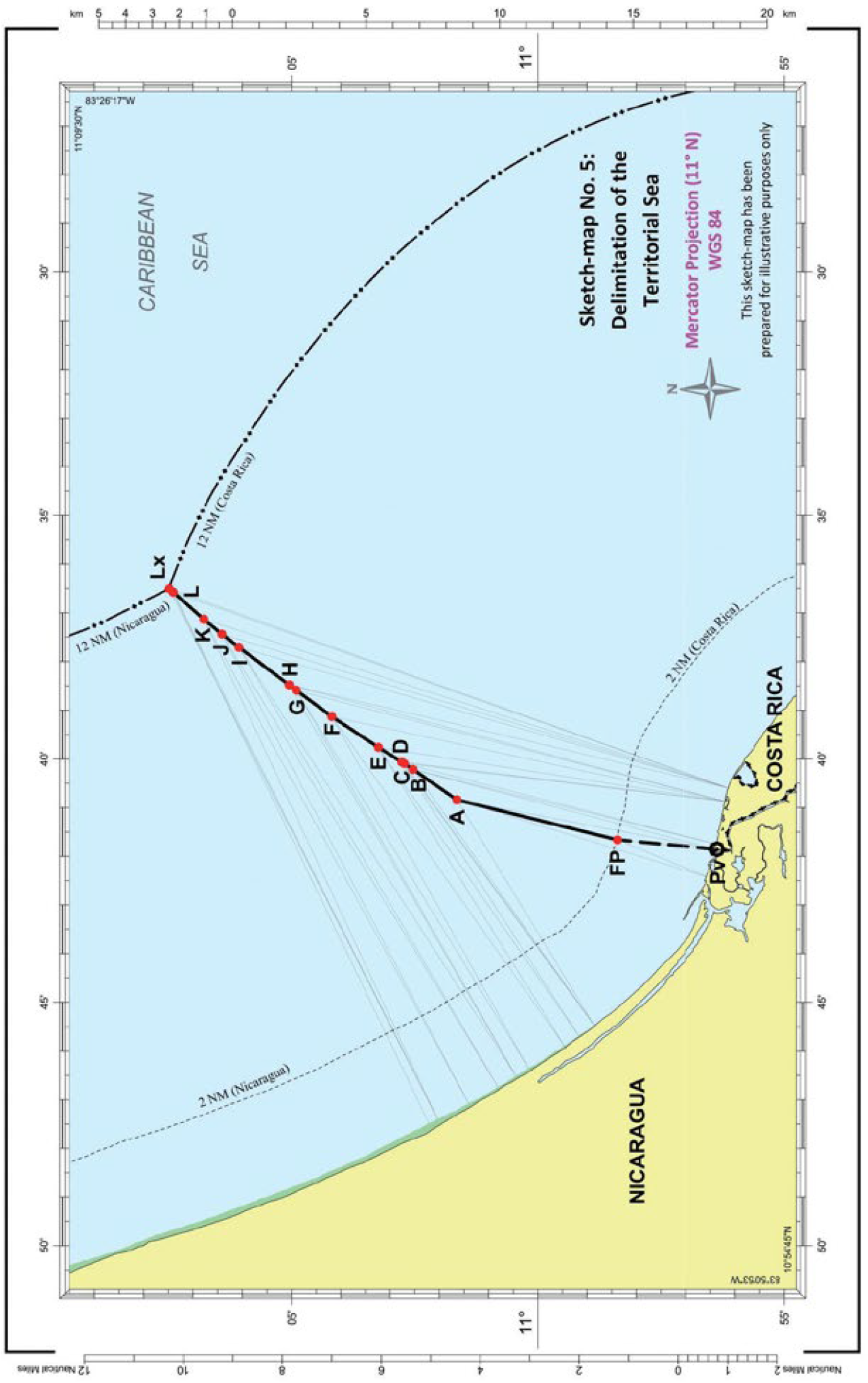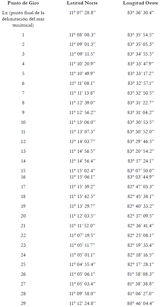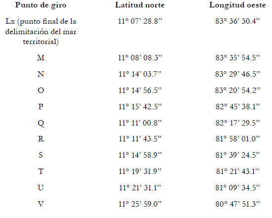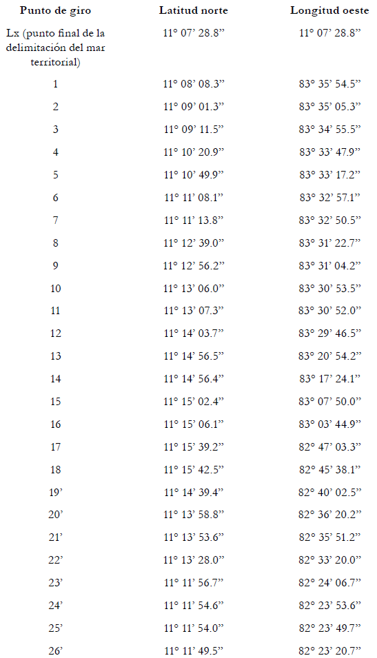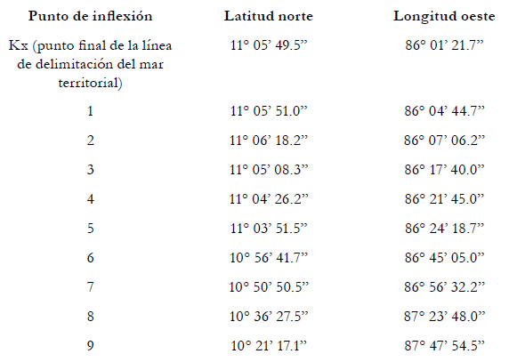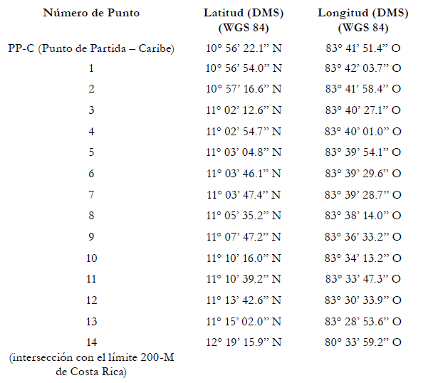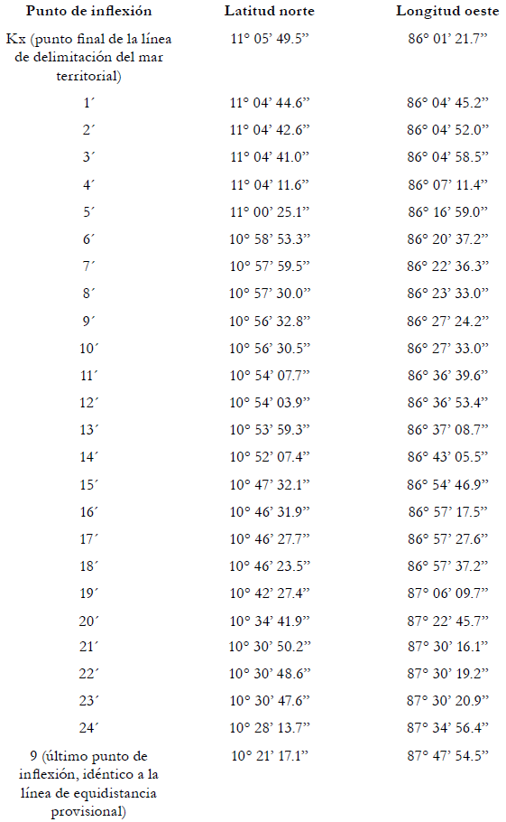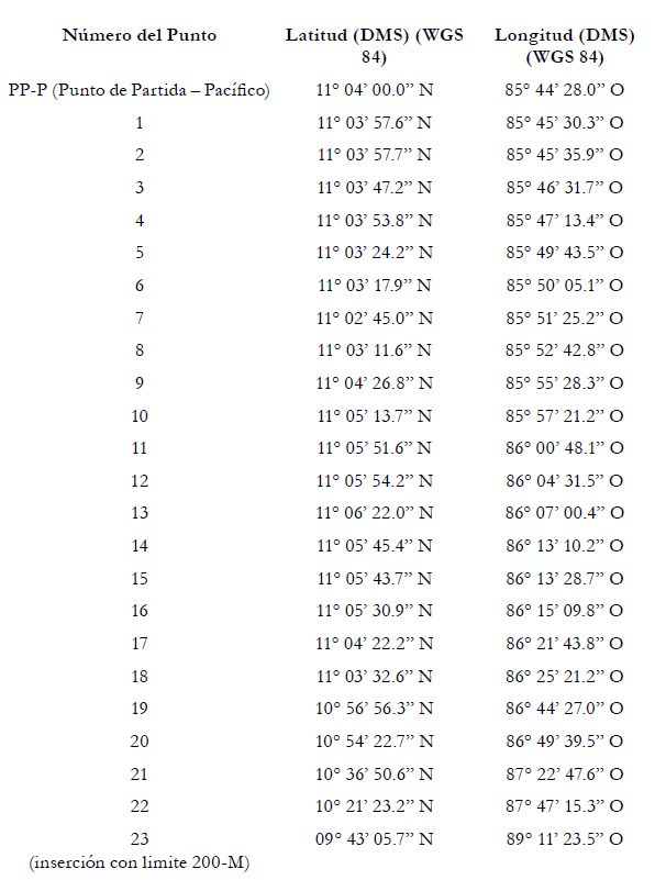 200. La Corte concluye que la frontera marítima que divide la zee y la plataforma continental entre Costa Rica y Nicaragua en el Océano Pacífico sigue una línea de equidistancia que parte del punto final de la frontera en el mar territorial (el punto Kx descrito con anterioridad en el párrafo 175, establecido con la ayuda de los puntos de base mencionados anteriormente en los párrafos 186-188, posteriormente ajustados de la manera descrita en los párrafos 198-199. La frontera marítima en la zee y en la plataforma continental sigue, en consecuencia, una serie de líneas geodésicas que unen los puntos cuyas coordenadas, de acuerdo con el sistema de referencia wgs 84, son las siguientes: