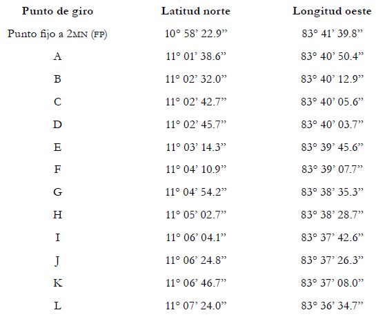La costa costarricense que corre a lo largo de líneas rectas que conectan Punta Herradura, Península de Osa, Punta Llorona y Punta Salsipuedes también es relevante - Costas del Golfo de Nicoya no son relevantes - Longitudes costeras medidas a lo largo de líneas rectas.