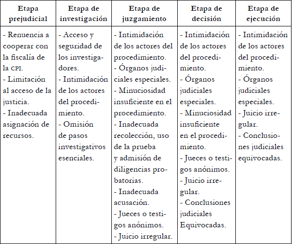 Una valoración global o de conjunto de los indicadores puede graficar que las etapas del procedimiento judicial presentan vicios manifiestos. De hecho, todos los indicadores muestran afectaciones en distintas etapas del procedimiento que culmina con la decisión adjudicatoria viciada. Si estoy en lo correcto al usar la nomenclatura procesal tradicional, se puede advertir que los indicadores afectan a cinco grandes etapas procedimentales: a) prejudicial, b) de investigación, c) de juzgamiento (discusión y prueba), d) de decisión y, e) de ejecución (tabla 1).