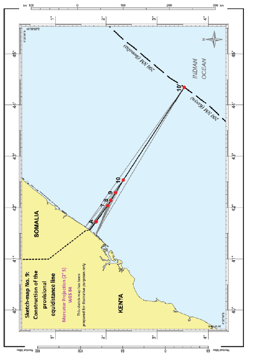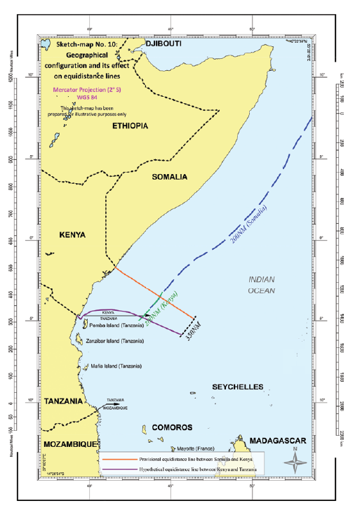 Además, al igual que la Corte, el juez ad hoc Guillaume considera que, como Estados sucesores, Kenia y Somalia están vinculados por los tres acuerdos celebrados entre Italia y el Reino Unido, las antiguas potencias coloniales, en 1924, 1927 y 1933, que fijaron la frontera entre ellas. Señala que estos acuerdos no fueron derogados en todo o en parte por acuerdo expreso o tácito entre las partes. El juez ad hoc Guillaume opina que, por lo tanto, le corresponde a la Corte aplicarlas de conformidad con el artículo 15 de CNUDM. En consecuencia, la Corte debió haber determinado primero si estos acuerdos delimitaron el mar territorial entre las partes hasta las 12 millas náuticas desde la línea costera. Por lo tanto, el juez ad hoc Guillaume no puede respaldar el razonamiento de la Corte de que "no es necesario decidir si el arreglo del tratado de 1927/1933 tenía como objetivo la delimitación del límite en el mar territorial" (sentencia, párrafo 109). Él considera que esto así fue, y que, en consecuencia, la línea de delimitación es una "línea recta que discurre en dirección sureste en ángulo recto con la dirección general de la costa en Dar Es Salam".