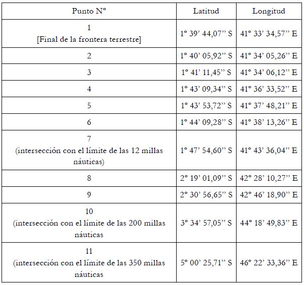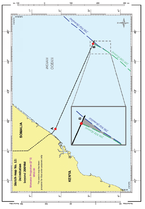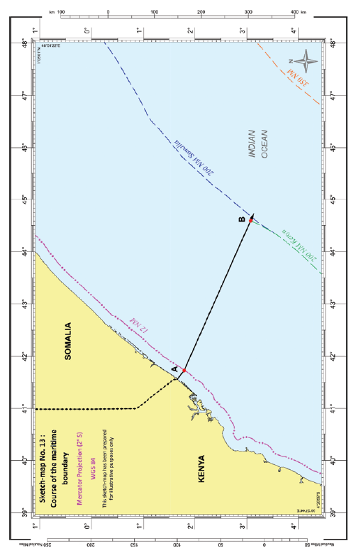 Decide que, desde el final del límite en el mar territorial (Punto A), el único límite marítimo que delimita la zona económica exclusiva y la plataforma continental hasta 200 millas náuticas entre la República Federal de Somalia y la República de Kenia sigue la línea geodésica que comienza en el acimut 114° hasta alcanzar el límite de 200 millas náuticas medidas a partir de las líneas de base desde las que se mide la anchura del mar territorial de la República de Kenia, en el punto con coordenadas 3° 4' 21,3" S y 44° 35' 30,7" E (was 84) (Punto B);