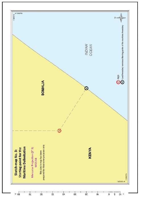 Decide que el punto de partida de la delimitación marítima que delimita las respectivas áreas marítimas entre la República Federal de Somalia y la República de Kenia es la intersección de la línea recta que se extiende desde el punto de delimitación permanente final (PB 29) en ángulos rectos en la dirección general de la costa desde la línea de bajamar, en el punto con coordenadas 1° 39' 44,0" S y 41° 33' 34,4" E (was 84);