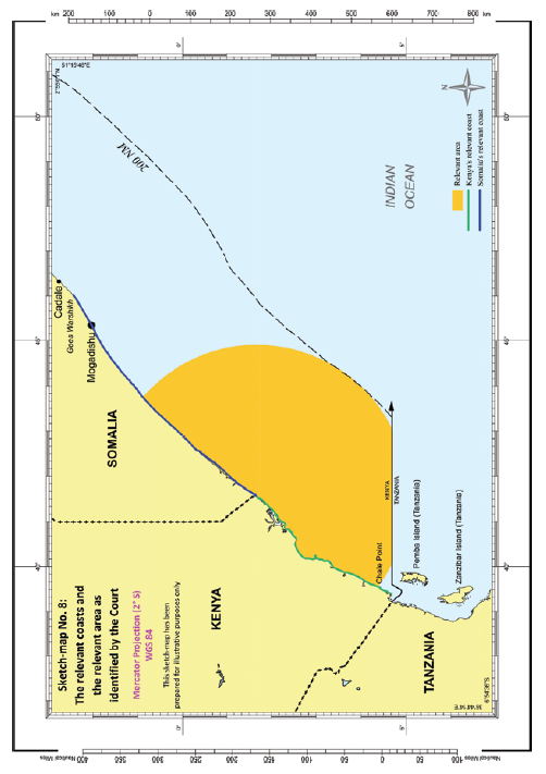 3. En el presente caso, la jueza Xue observa que la costa de las partes en la zona es simplemente recta, sin particularidades marítimas ni indentaciones. Al estar adyacentes, las costas de las partes son ambas hacia el mar, lindando con la misma área marítima y la misma plataforma continental. Como lo ilustra el croquis No. 8 de la sentencia, una parte sustancial de la costa relevante de Somalia identificada por la Corte, no genera derechos que realmente se superpongan con los de la costa de Kenia. Señala que, aunque normalmente se utiliza la proyección radial para identificar las costas pertinentes, es cuestionable su uso en las presentes circunstancias pues extiende demasiado la longitud de las costas pertinentes, en particular la del lado somalí. Se refiere al caso Ghana/Côte d'Ivoire, que compartía muchas similitudes con el presente caso. En su opinión, la identificación de las costas relevantes y el área relevante por el ITLOS refleja adecuadamente el nexo técnico entre las costas relevantes y el área relevante a los efectos de la delimitación, ella enfatiza que debe ser la realidad geográfica y los derechos superpuestos genuinos los que determinen qué parte de una costa es relevante.