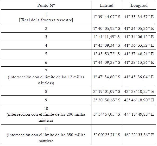 195. En cuanto a las circunstancias relevantes invocadas por Kenia para el ajuste de la línea de equidistancia provisional, la Corte ya las consideró anteriormente y ajustó la línea acordemente en la zona económica exclusiva y en la plataforma continental hasta 200 millas náuticas. La Corte recuerda que tanto Somalia como Kenia han reclamado una plataforma continental que se extiende hasta las 350 millas náuticas en la mayor parte del área de reclamaciones en superposición. Somalia ha reclamado una plataforma continental más allá de las 200 millas náuticas, incluida la zona comprendida entre el punto OL1, situado al final de la línea de equidistancia que reclama como límite marítimo, en las coordenadas 5° 00' 25.69" S y 46° 22' 33.34" E, y el punto OL7, ubicado más al norte, cerca del paralelo de latitud, en coordenadas 2° 00' 47.69" S y 49° 26' 05.09" E. Kenia ha reclamado una plataforma continental hasta 350 millas náuticas en el área comprendida entre el punto ECS1, ubicado en la línea hipotética construida como una extensión del límite existente con Tanzania en las coordenadas 4° 41' 00.29" S y 46° 34' 36.02" E, y el punto ECS38, ubicado más al norte a poca distancia del paralelo de latitud, en las coordenadas 1° 44' 21.82" S y 47° 24' 13.79" E. En vista de lo anterior, la Corte considera oportuno ampliar la línea geodésica utilizada para la delimitación de la zona económica y la plataforma continental dentro de las 200 millas náuticas para delimitar la plataforma continental más allá de las 200 millas náuticas.