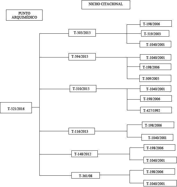 Una vez establecida la pregunta problematizadora y las dos opciones que servirán de extremos a las respuestas dadas en cada sentencia, se procede a esquematizar la línea jurisprudencial, detectando el punto arquimédico y el nicho citacional: