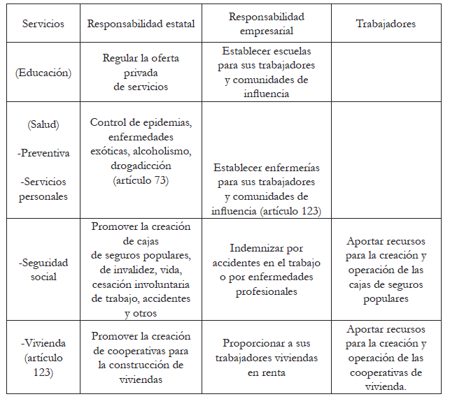 Se suele decir que la Constitución mexicana fue la primera de corte social, y esto suele confundirse con la existencia de un Estado social. Sin embargo, un análisis del texto original de la Constitución nos deja claro el papel acotado del gobierno como garante de derechos sociales.28 En relación con los servicios públicos de salud y educación, se “responsabilizó alas empresarios de buena parte de su oferta social”. 29 Esto se puede apreciaren el siguiente cuadro: