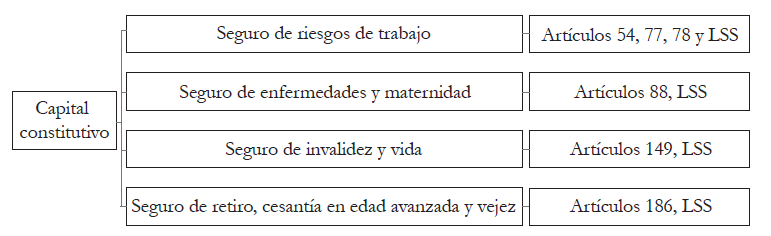 La figura del capital constitutivo aplica en el caso de que el patrón que estando obligado a asegurar a sus trabajadores no lo hiciera, o lo hubiera hecho, pero manifestando un salario inferior al real, teniendo como fundamento legal varios artículos de la LSS de acuerdo con el seguro aplicable por el riesgo sufrido por el trabajador, pudiendo fincarse por cualquiera de los seguros que comprende el régimen obligatorio, excepto por el de guarderías y prestaciones sociales (tabla 1).