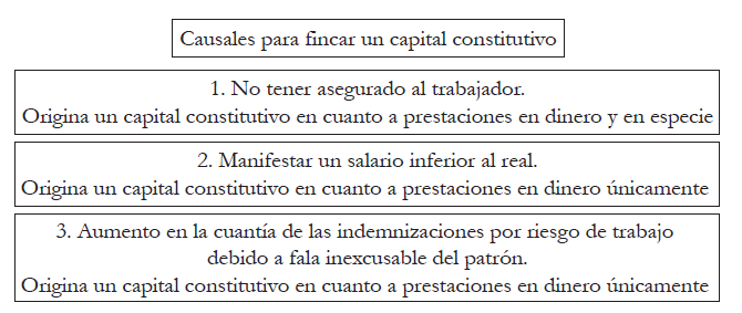 Sumario: I. Introducción. II. Concepto de capital constitutivo. III. El capital constitutivo en la legislación mexicana. IV. El capital constitutivo en la Ley del Seguro Social. V. Conceptos que integran un capital constitutivo. VI. Capital constitutivo por no tener asegurado a un trabajador. VII. Capital constitutivo por registrar a un trabajador con un salario inferior al real. VIII. Capital constitutivo por falta inexcusable del patrón en la ocurrencia de un riesgo de trabajo. IX. Pago de capitales constitutivos. X. Medios de defensa. XI. Prevención del capital constitutivo. XII. A modo de conclusión. XIII. Fuentes de consulta.