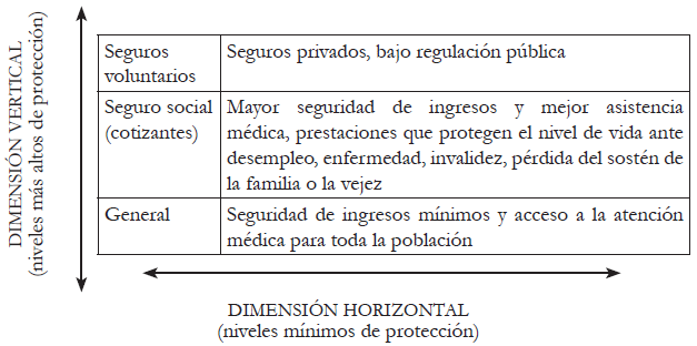 Así, la extensión de la cobertura de la seguridad social horizontal es posible mediante el “piso de protección social” como etapa introductoria en aquellos países y en aquellas situaciones en las que todavía no se dispone de una seguridad social formal. Por su parte, la cobertura vertical o cualitativa se da a través de los seguros obligatorios y voluntarios, porque implican una protección mayor.