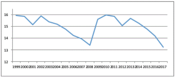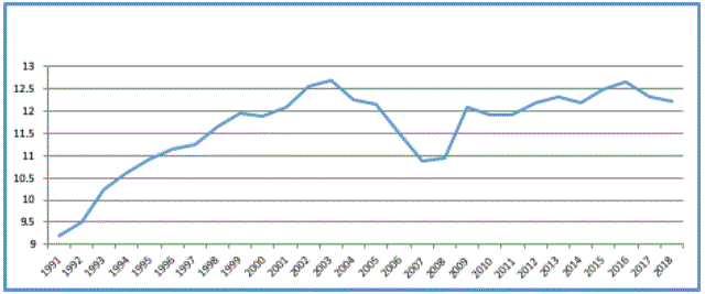 En cuando a los porcentajes de desempleo de las personas jóvenes, ésta se situó en el 12.21% en 2018, viniendo del 12.69% en 2003, cifra máxima en la serie histórica reciente.