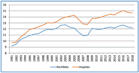 En este caso, y como se observa en el gráfico anterior, la diferencia entre ambos porcentajes se había mantenido durante muchos años en 1 punto porcentual, siempre más elevado en las mujeres jóvenes que en los hombres, se eleva ligeramente en 2005 por encima de los dos puntos, en 2009 vuelve a reducirse a 1.6 puntos (diferencia menor de los últimos años), pero a partir de 2010 la diferencia vuelve a crecer y el dato de 2018, que corresponde a 2.43 puntos porcentuales es el mayor de toda la serie histórica. Este dato ha de hacer reflexionar a los gobernantes ya que la brecha entre géneros no sólo se consolida, sino que aumenta, se trate de momentos de desarrollo económico o de crisis, con los efectos negativos que esto supone.