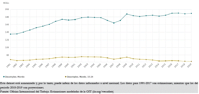 Estos datos suponen que en 2018 había aproximadamente 71 millones de personas jóvenes en situación de desempleo a nivel mundial, medio millón más que el año anterior. Además, se calcula que, con datos del mismo año, alrededor de 156 millones de jóvenes ocupados, es decir, el 37.7% de los trabajadores jóvenes, vivían en una situación de extrema pobreza o moderada.20 Los datos muestran una tendencia en los últimos 25 años de índices de desempleo juvenil entre el 12 y el 14 % del total del colectivo; en general, el doble de los datos para el desempleo general. Los datos parten de porcentajes del 12.1% en 1991, con un alza continuada que presenta su punto culminante en 2003 (14.3%), con un descenso casi a datos de 1991 en 2007 (12.6%), seguido de un crecimiento con dos picos, en 2009 (13.7%) y 2013 (14%).
