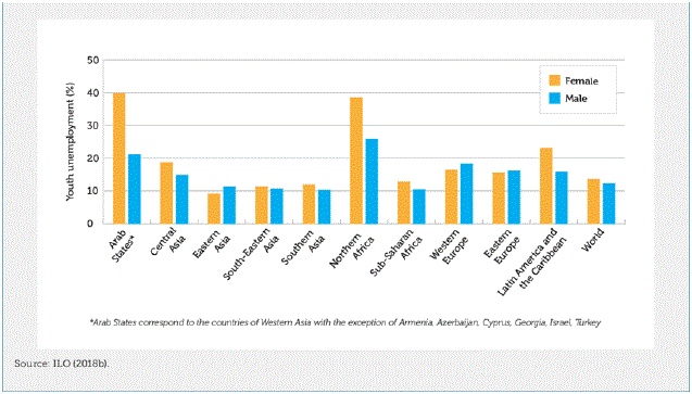 Si se concreta por regiones, las divergencias más importantes (más de 50 puntos porcentuales) se sitúan en los Estados Árabes, África del Norte y Asia Meridional, que a su vez corresponden a las tasas de actividad más bajas de las mujeres jóvenes (menos del 30% en comparación con un porcentaje mundial del 49%). En tercer lugar, en relación con el desempleo, es evidente que las mujeres jóvenes presentan los datos más altos de desempleo, si se compara con los trabajadores jóvenes hombres. En 2018, según datos del Banco Mundial, el porcentaje total de desempleo femenino se ubica en el 5.43% (4.65 % si se trata de desempleo total en los hombres), cifra que presenta un continuado descenso, aunque moderado, si se compara con el 5.68% de 2016 y el 5.52% en 2017.