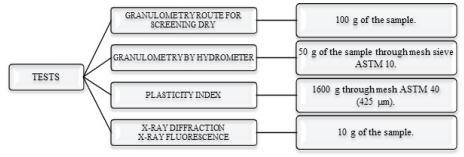 The collected in situ sample was tested according to the 4113-1 NTC and 4113-2 NTC procedures, the moisture content was determined and then the drying process was performed at 110±5 °C. After drying the sample, pre-grinding was performed to a size of 10 mm [4]. Then it was crushed in a hammer mill to a size not exceeding 2 mm, in order to obtain a homogeneous and uniform particle size. It was then sieved to a ASTM 10 mesh being prepared for analysis of physical characterization. An outline of the analyses is shown in Figure 2.