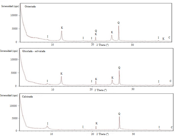 As detailed in Figure 3, from the oriented sample it is observed that the major peaks are associated with kaolinite (K) and illite (I), this matches most clays found in the eastern region of North Santander; Quartz also has contributions (Q) with a principal line at 3.34 Å. The diffraction characteristics of the kaolinitic minerals are present in the diffractogram 7.14; 4.24; 3.57; 2.38 Å; There are also diffractions illite: 4.97; 4.47; 2.45 Å, and it can be precised that the existing carbonate is calcite, which occurs in diffraction 2.28 Å (6(.
