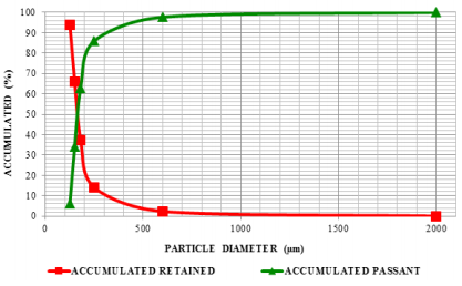 Sieve analysis by dry sieving: the particle size was determined using a representative sample of 100 g, the assay was performed using dry-sieve opening mesh ASTM 10 (2000 μm), 30 (600 μm), 60 (250 μm), 80 (180 μm), 100 (150 μm) and 120 (125 μm) and collector, the results can be seen in Figure 4.