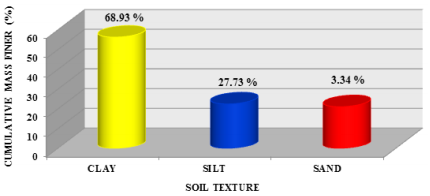 In the results in Figure 6, it is observed that in the distribution of fractions it is predominant the clay material with a percentage of 68.93%, this is the reason for its high plasticity as shown in Table 2, followed by fraction silty fine-medium 27.73%, it can be concluded that this fraction also helps the development of plasticity; finally, the sand fraction is 3.34% and it is associated with spherical particles with a diameter greater than 2 mm indicating that generally is silty clay samples. The clay fraction is associated with very fine clay minerals that are primarily responsible for the plasticity of the same; so its grain size is suitable for all kinds of ceramic applications.