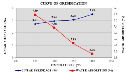 In Figure 8, the curve gresification diagram details that the clay has no significant changes to 1050 °C, however above this temperature, an increase occurs in linear shrinkage and a decrease in water absorption, so the sample above 1050 °C and below 1100 °C generates stability in their crystalline components, a minor vitreous phase leads to a decrease in the deformation of the work piece and reduce the chances of defects in them.