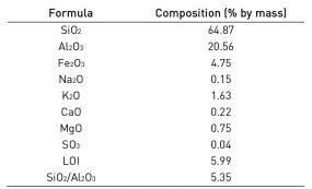 It may indicate a significant presence of free silica because the intensity peak of quartz and the high molar ratio SiO2/Al2O3 (2, 7, 8(. According to the results of chemical analysis, which is shown in Table 1, K2O content of samples reaches a value of 1.63%, a fact that suggests the existence of micaceous minerals in relatively high proportions, although the existence of other layered minerals cannot be ruled out. The Fe2O3 content seems to indicate the presence of free iron oxides and the low content of alkali oxides and