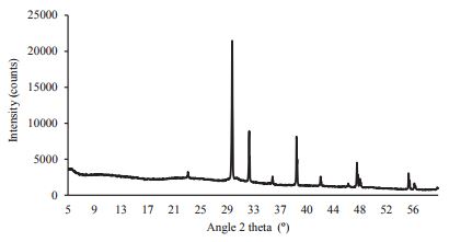 X-ray Diffraction (XRD) was used to obtain information of the crystal structure, chemical composition, and physical properties of the sample of the obtained bioactive glass. The assay was carried out using a Rigaku Miniflex X-ray powder diffractometer, equipped with a Cu source with λ = 1.5818Å, ranging 2θ from 0° to 60° at 2°/min.