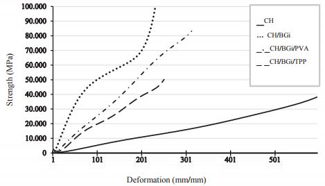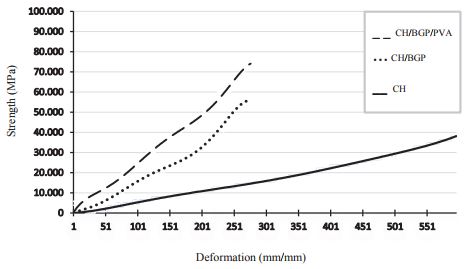 In this section, the stress-strain (SS) plots for each of the samples are presented. Figure 9 shows the SS plot for the CH sample, which will be used as reference (Maximal stress (MS): 37.5 KPa) and the SS plots for CH/BGp (MS: 56.1 KPa) y CH/BGp/PVA (MS: 73.6 KPa) samples. It was not possible to obtain an adequate CH/BGp/TPP sample for mechanical characterization, due to a high crosslinking speed, which produced an amorphous and heterogeneous sample.