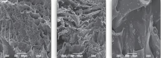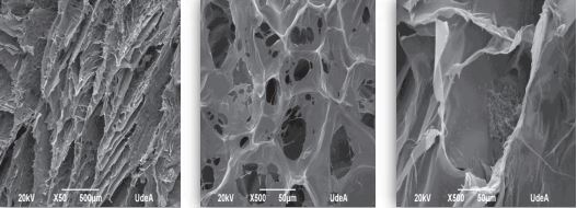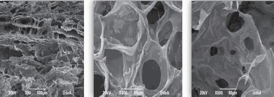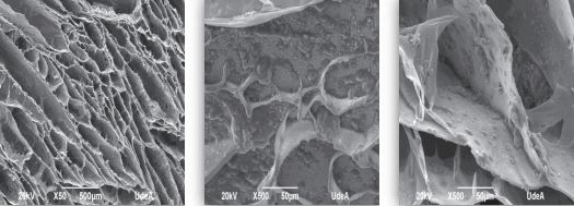 The Figures 6 to 8 show the images obtained for scaffolds of CH and BG powder (CH/BGp) and the PVA (CH/BGp/PVA) and TPP (CH/BGp/TPP) crosslinked scaffolds, respectively.