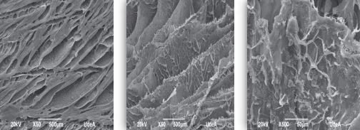 This formation is due solely to the use of PVA as crosslinking. Interconnected channels in the cross section (left) and low porosity in the outside (right) of the scaffold are also observed.
