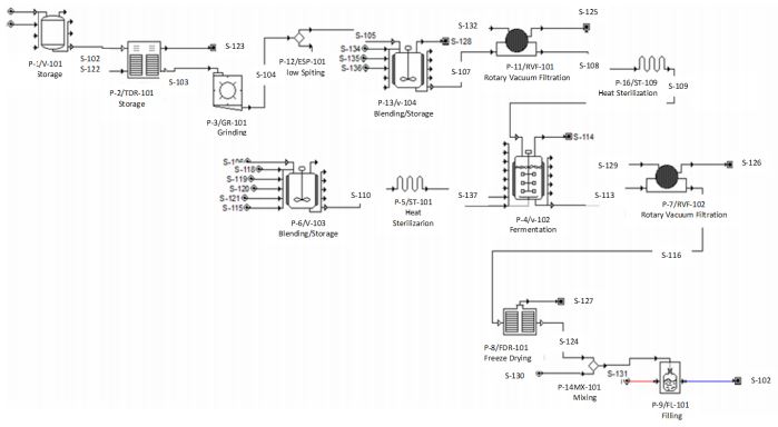 The experimental data showed an activity of 0.62 U/mL (Table 2), which is consistent with the prediction 14; therefore, these nutrient concentrations were chosen for the plant design in the industrial simulator. It is important to point out that it is not a replica of the MTGase production plant but a design based on the MTGase production process from sorghum grains. For comparison and validation of the feasibility of production of the enzyme with enzymatic hydrolysate media of sorghum, an MTGase production plant with a common culture media, which has glycerol as a carbon source, was designed in the same simulator.