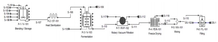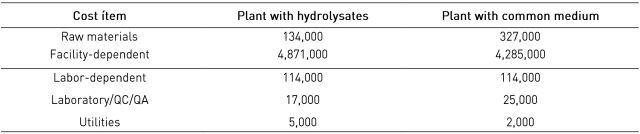SuperPro Designer ® Version 7.5 was used for the economic analysis of the process design (Figure 2). The cost of equipment was obtained from the SuperPro-Designer database or at the website http://www.kitmondo.com. The total equipment purchase cost was 4.413 x106 US$ and 3.901 x 106 US$ for plant with hydrolysates and common media, respectively. This was the basis for calculating the cost of other components of the fixed capital investment such as installation, instrumentation, etc. These costs are show in Table 2.