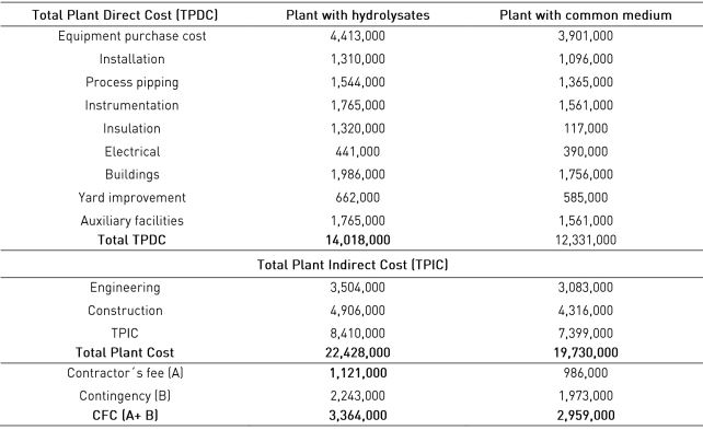 The sum of capital investment is analyzed formerly (Table 2) showing the total plant direct costs (TPDC) and indirect costs (TPIC). The TPC is estimated at 22.428 x 106 US$; adding contractor fees and contingency costs results in a direct cost of fixed capital of 25.792 x 106 US$.