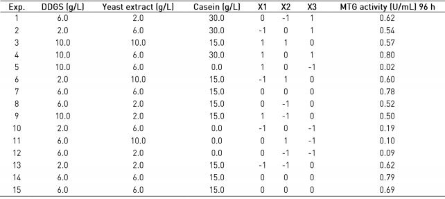 Fermentations were conducted with different culture media to determine the best composition of components and increased production of MTGase, A Box-Behnken experimental model was performed for culture media with three factors and three levels of 72 and 96 h of fermentation. Three different concentrations of casein, yeast extract, and DDGS were tested. Concentrations of glucose 30 g/L, MgSO4 0.5 g/L, KH2PO4 g/L, Na2HPO4 g/L, and peptone 10.5 g/L were kept constant in all media.