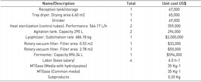 In the MTGase production plant based on sorghum hydrolysates, 4,916 kg of enzyme are obtained per year which yields 3,680 units/batch, while the enzyme produced with the common medium produces 4,550 units per batch with a production of 8,505 kg of MTGase per year. Although less equipment is used in the plant that produces the enzyme with glycerol as a carbon source, the cost does not decrease significantly due to the amount of some raw materials such as casein. In the medium with hydrolysates a casein concentration of 19 g/L is used, while in the medium with glycerol 38 g/L is used.