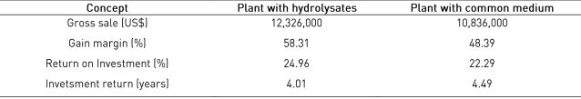 The prices of equipment and raw materials were consulted in the same sources as in the previous plant. The same number of operators for the process and the same number of hours and wages were used (Table 5). This plant shows an annual income of 10.836 x 106 US$ of which 10.774 x 106 US$ correspond to MTGase marketing and the remainder to the sale of fermentation by products (0.20 US$/kg). A profit margin of 48.91% and a return on investment of 22.29% were defined. According to all the data, it was determined that the return on investment time is 4.49 years as shown in Table 6.