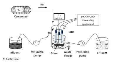 The SBR reactor was a glass-made cylinder (26 cm height and 14.5 cm diameter), with 2 L effective volume. The reactor had three openings: one for feeding raw wastewater, another for emptying the reactor, and the last one for sludge withdrawal. Peristaltic pumps were used for the processes of filling and withdrawal (Easy Load II, Masterflex L/S, Cole Parmer, USA). Aeration was supplied through an air compressor (Elite 801, Hagen inc, China). It provided airflow of 2,500 cm3·min-1 through a fine bubble diffuser located at the base of the reactor. The reactor contents were mixed by means of a stirrer whose speed was maintained between 100 to 150 rpm using an inverter (Powerstat 3PN116C, The Superior Electric CO, USA). The temperature of the wastewater in the reactor was the same as laboratory temperature, it was ranged between 25.1 and 25.6 ºC in the range of 25.1 to 25.6 ºC. The system was automated by digital timers (Thomas Scientific, USA). The principle diagram of the biological system with all major components is shown in Figure 1.